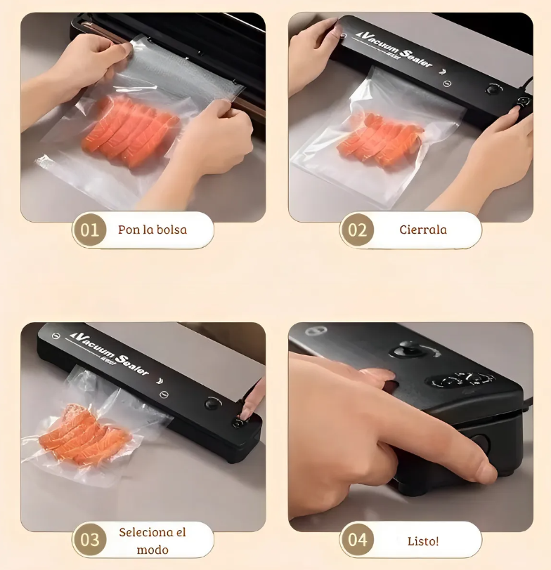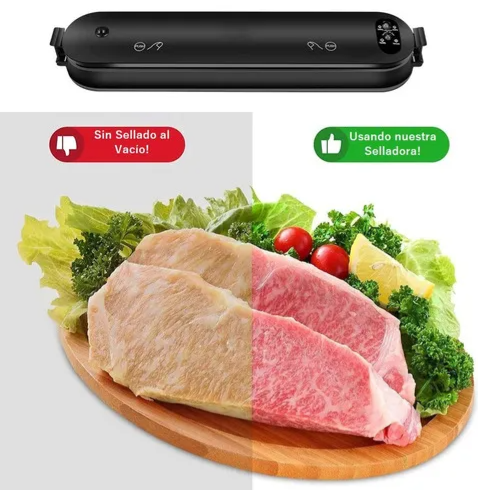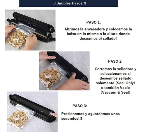Selladora Envasadora Al Vacío Alimentos + 10 Bolsas ¿Cansada/o de que algunos alimentos se pongan malos y ya no se puedan consumir? Sobre todo quesos, frutas y verduras. El moho, que puede ser causante de enfermedades bacterianas gastrointestinales, no se suele ver hasta luego de 2 días de que este se instaló, lo que significa que es probable que tengas varios alimentos en tu refrigerador que ya tengan moho sin que se vea. ¿Cómo la selladora Vacuum Sealer te ayuda a solucionar esto? La principal causa de generación de moho es el contacto de un alimento y su propia humedad con el aire. La Vacuum Sealer permite solucionar este problema. Todo en uno: La selladora Vacuum Sealer cuenta con un sistema especial que no solamente extrae todo el aire de la bolsa, sino que también la sella. Sellado de gran presión: No hay alimento que la Vacuum Sealer no pueda procesar. Se pueden sellar desde carnes, quesos y vegetales fácilmente. La operación es muy sencilla, solamente tienes que enganchar la bolsa, cerrarla, presionar un botón y la Vacuum Sealer se encarga del resto. Beneficios de sellar al vacío: - Mayor duración del producto, conservando su color y frescura a lo largo de un período de 15 a 90 días de acuerdo al producto envasado. - Higiene, al ser un envase completamente hermético no permite la salida de líquidos o grasa. - Las bolsas son totalmente libres de BPA, 80 micrones de alta calidad. - Optimización de espacio en tu refrigerador. Al remover el aire, la comida ocupará menos espacio. Tiempo medio de conservación dependiendo del alimento: - Quesos duros: 120 días - Quesos semi-duros: 60 días - Quesos blandos: 20 días con gas - Embutidos secos: 60 días - Embutidos frescos: 25 días - Fiambres con alto contenido de líquidos: 30 días - Fiambres secos músculos (Jamón crudo, bondiola): 90 días - Panificados: 30 días - Sándwiches: 15 días - Tortas: 15 días - Pizzas listas para hornear: 15-30 días - Pan dulce: 60 días - Carnes vacunas: 30 días - Carne de cerdo: 20 días - Carne de pollo: 20 días - Pescados: 5 días - Cabrito, chivito, oveja: 30 días - Conejo: 10 días - Pastas pasteurizadas: 20 días con gas - Pastas sin pasteurizar: 15 días con gas - Verduras frescas: 10 días depende mucho del tipo de producto y si está porcionado y/o entero - Papas bastón: 15 días - Panqueques: 20 días con gas - Milanesas de soja: 30 días con gas - Comidas preparadas cocidas: 10 días - Frutos secos: 12 a 18 meses - Dulces membrillo, batata: 30 días - Especias: 12 meses.