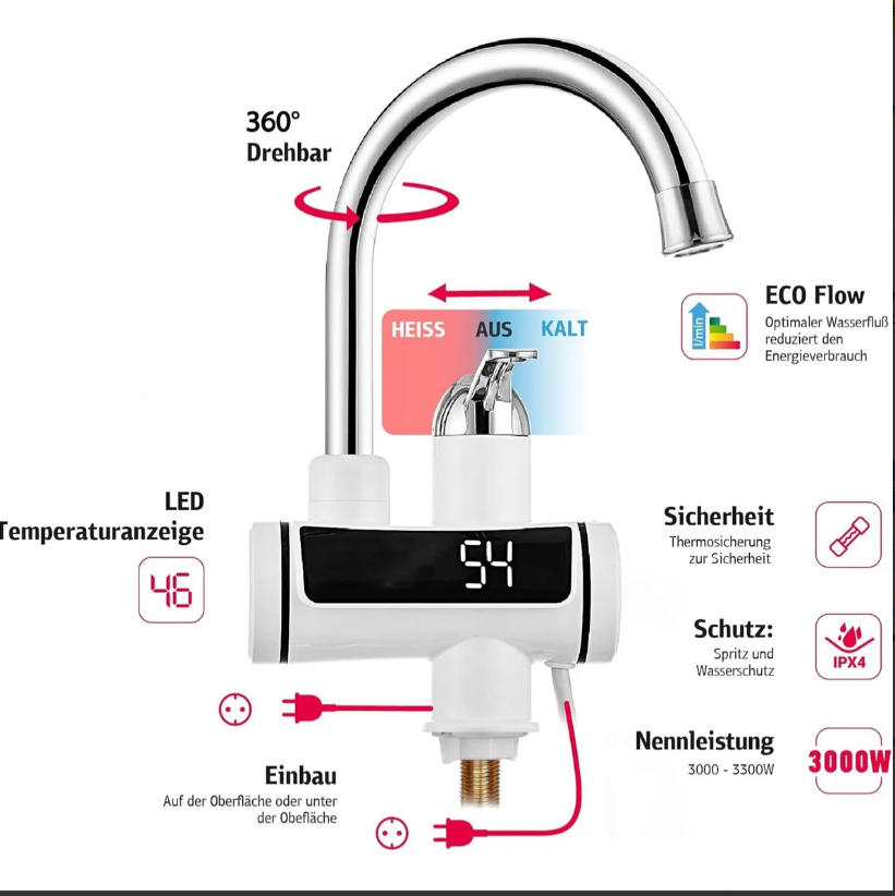 Atención: SI NO TIENE BUENA PRESIÓN DE AGUA ESA CANILLA NO LE VA A SERVIR. LA CANILLA SE MANDA REVISADA Y PROBADA , FUNCIONA 100 % Ventajas: ABS plásticos de ingeniería, resistente a altas temperaturas, suave y fuerte, no es fácil de ráfaga de forma elevada estabilidad. Fuerte anti-estampado, la radiación UV, por lo que el producto no es fácil de envejecimiento de la seguridad es más resistente y duradera. En general, a decir al menos, la temperatura a unos 20 grados a 40 grados en invierno y 30 grados a 50 grados en verano, dependiendo de la cantidad de agua. Nota: Cuando haya recibido el calentador de agua, por favor, no prueba en tus manos, es necesario instalarlo bien y luego la prueba, o sea peligrosa. Por favor lo operan de acuerdo con las instrucciones. Ventajas: 1. Ahorrar agua, ahorrar energía, ahorrar tiempo, ahorrar espacio, es seguro y cómodo de usar. 2. El diseño de aislamiento de agua y electricidad que el producto seguro y el grifo de calentamiento instantáneo puede estar seguro de usar. 3. El agua se caliente en 3-5 segundos de encender el interruptor, y no es necesario precalentar el agua y el almacenamiento de agua. 4. Grifo de agua lateral y bajo el agua del grifo es adecuado para cada familia. 5. La suave curva de diseño de las apariciones que el grifo compacta, hermoso, de clase alta, y la moda. 6. El grifo de calentamiento instantáneo puede sustituir al grifo original; único manejar la operación; agua caliente y fría regular fácilmente; se puede utilizar cómodamente. Seguridad: la separación de agua y electricidad, segura y fiable de ahorro de energía Time&: Flujo de agua caliente en 3-5 segundos el ahorro de agua: agua caliente rápidamente para el agua no se perderá el ahorro de espacio: El Grifo de calentamiento instantáneo es compacta y hermosa comodidad: La boquilla puede girar en 360 grados y 180 grados fácil de usar: Paso menos control de temperatura, agua fría y caliente será operado por Solo manejan la boquilla del grifo de calefacción instantánea puede ser eliminado, por lo que es conveniente limpiar. El Grifo de calefacción instantánea puede ser utilizado en la cocina y cuarto de baño, en el único doble lavamanos grifo de calentamiento instantáneo; esto puede reemplazar el original de grifo. *El material principal: ABS Engineering Plastics * Temperatura 30 a 60 C° *Tubo de calefacción: Calidad de acero inoxidable 304 *Rotación: 360 ° Rotativo *Voltaje nominal: 220V / 50HZ *Energía clasificada: 3000W *Presión de trabajo: 0.01-0.06 MPa *Grado impermeable: 1PX4 *Diámetro del conector: G1 / 2 ' *Longitud del cable: aproximadamente 1,2 m *Altura del pico: 180 mm *Longitud del grifo: 250 mm *Diámetro de la base: 50 mm *Tipo de enchufe: AU Plug
